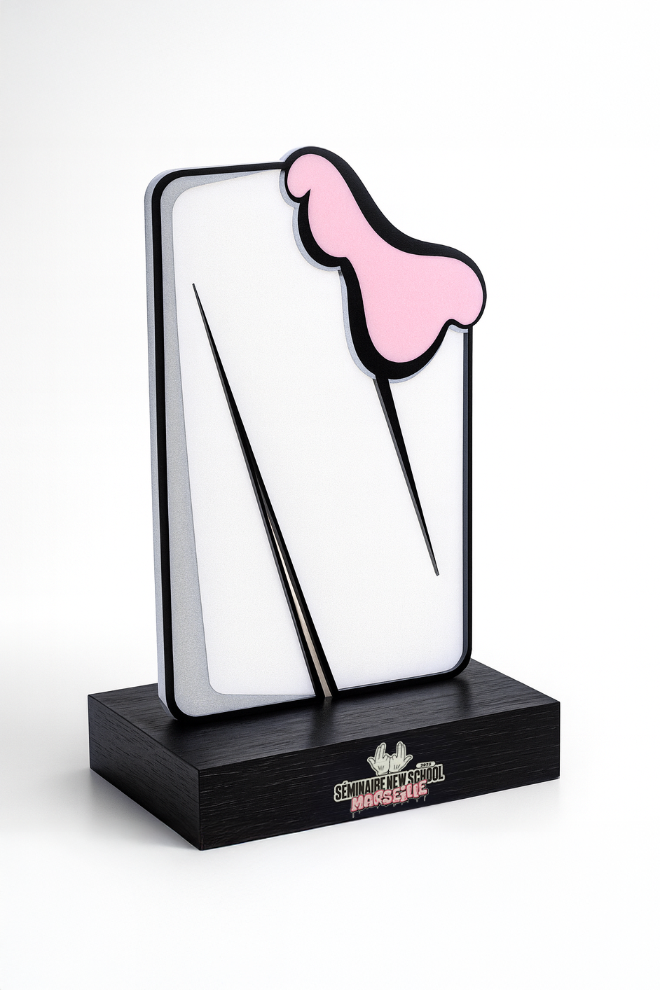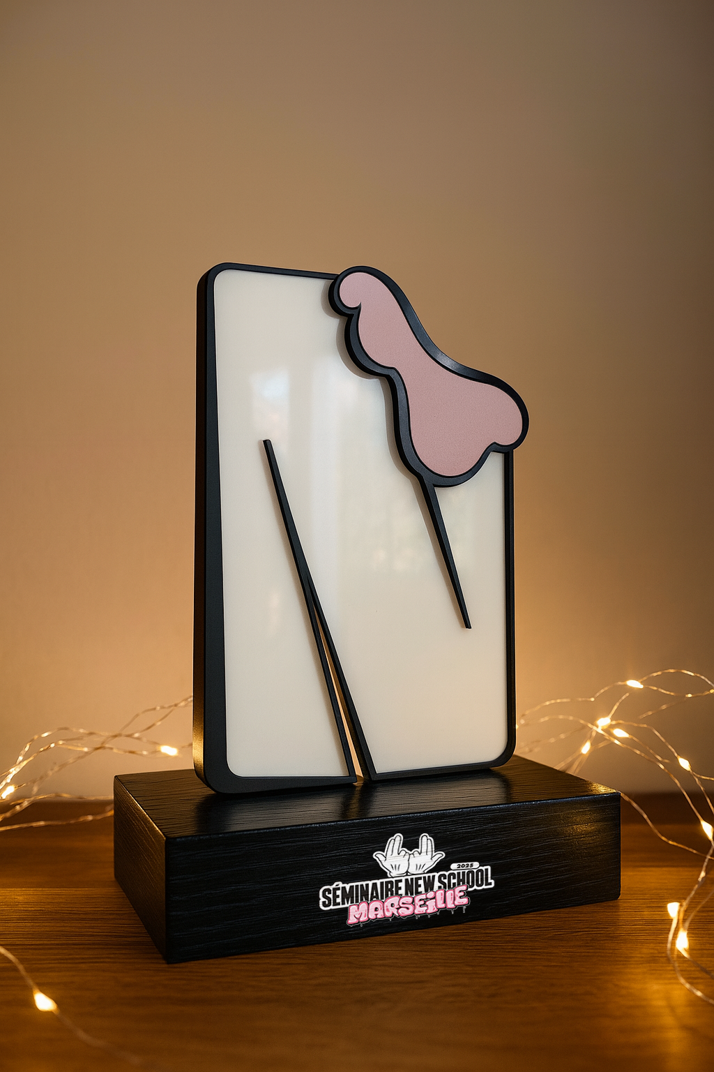 Imaginé par l’équipe de New School, ce trophée est dans un style pop avec les couleurs de la charte graphique New School. J’ai sélectionné des matériaux brillants afin de donner du relief au trophée.